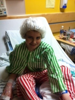 A really fun part of today – was Ryleigh’s hair washing. How cool is this – they have this shower cap thing that you heat up in the microwave, put on your head and scrub into your hair. After about 3 minutes you remove the cap and your hair is washed and conditioned. Ryleigh loved it and it picked up her spirits. She also got a change of pj,s, We decided that they came from the North Pole and they are the outfit elves wear when they are naughty and go to jail! Doesn’t she look happy: