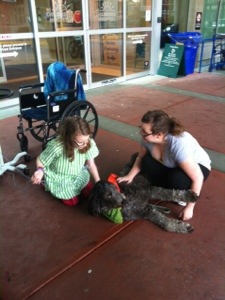 Thanks to Dan, who has made the journey down to Vancouver, Ryleigh was motivated to get out of her room and head downstairs to the front entrance. She was in a wheelchair nevertheless she was out of her room for something other than a test or procedure. Dan has been taking care of our buddy Jakob – our goldendoodle. Jakob is special to all of us in different ways. For Ryleigh, he is a source of comfort and joy. At home, Ryleigh will spend time with Jakob to help her relax and help with pain and fatigue. Jakob is so soft and furry he is like a live stuffed animal. Dan brought Jakob to the front entrance today and Ryleigh got to spend time with him. Pet therapy is very beneficial.