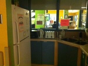We are lucky to be across from 3F’s kitchenette. We have a shelf in the fridge for our items and then use of the basic equipment – microwave, kettle, and toaster oven.