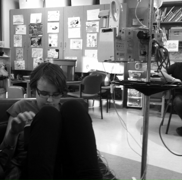 Today was the first day of the beginning of the process Ryleigh has to go through. She spent all day in the oncology/hematology clinic getting her first dose of cyclophosphamide – a chemotherapy drug that slows down the bone marrow’s production of cells. This will allow for making room so that more stem cells can be made. Ryleigh handled the whole day with a really good attitude and was quite upbeat and positive. I sense from her recent relief and  calmness that she must things are starting and that she may be getting help to feel better.