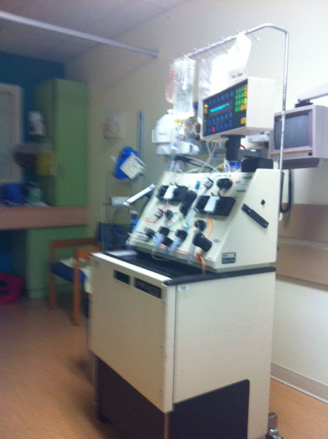 As soon as she was completed that procedure (about an hour and a half) they had everything set up in her hospital room to collect the stem cells. This is the machine that does the collecting: . It is takes the blood out of her body (her total volume of blood) is removed, the stem cells are removed, and then blood is returned to Ryleigh. She had this happen 7 times and was hooked up to the machine for over 5 hours. The centrifuge that spins really quickly and the different blood cells sort out because of their weight and gravity.